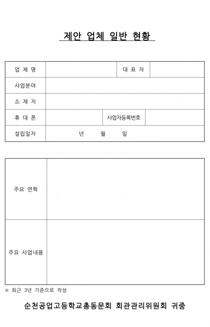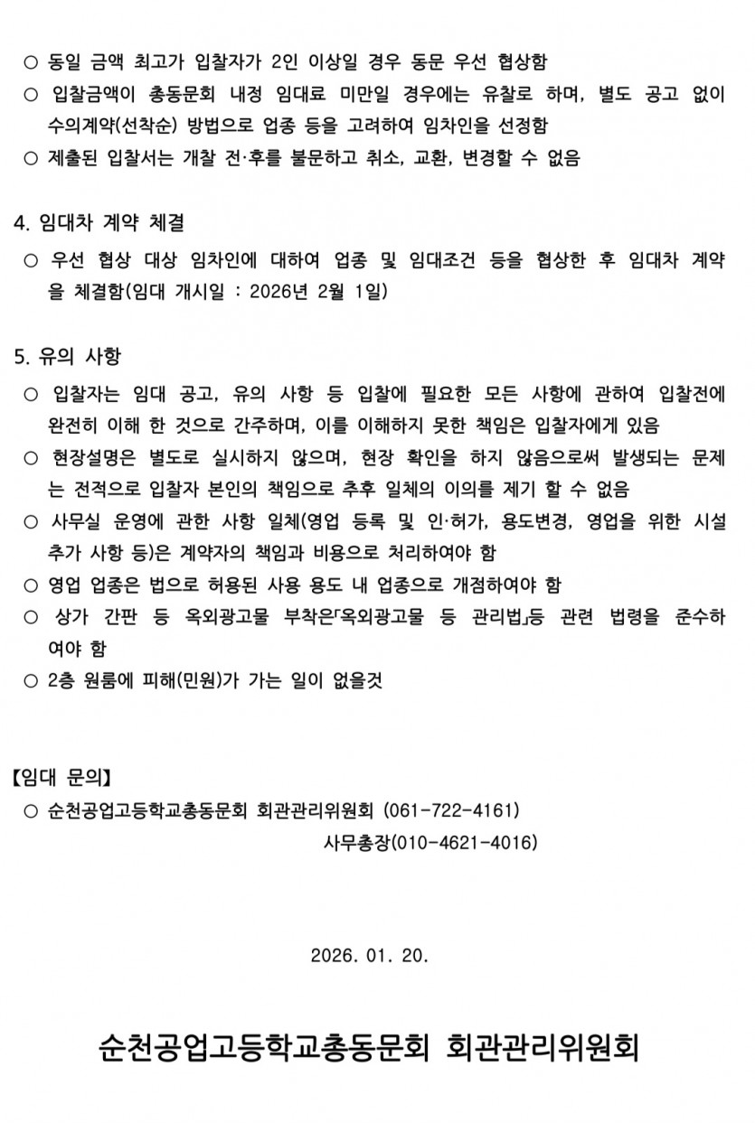 구)순천공고 총동문회관 사무실 임대 입찰 공고문 페이지 정보 작성자 총동문회 댓글 0건 조회 168회 작성일 26-01-22 11:40 목록 답변 본문 구)순천공고 총동문회관 사무실 임대 입찰 공고문 이전글2026년도 순천공고총동문회 정기총회 개최 26.02.05 다음글2025년 순천공업고등학교 총동문 추계 산행 안내 25.09.23 댓글 0 댓글목록 등록된 댓글이 없습니다.