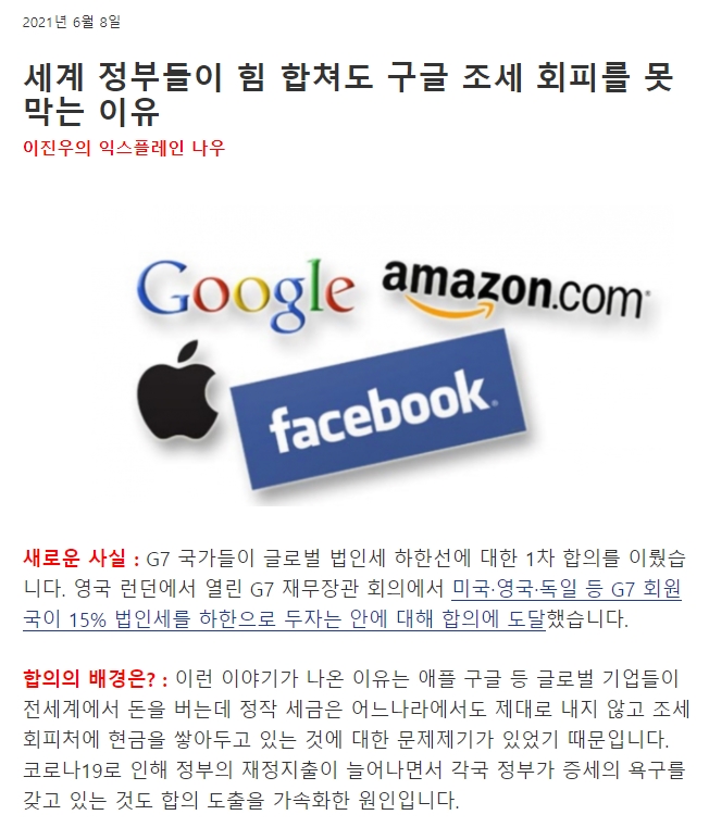 세계 정부들이 힘 합쳐도 구글 조세 회피를 못 막는 이유 페이지 정보 작성자 송은주 댓글 0건 조회 3,033회 작성일 21-06-08 12:45 목록 답변 본문 - 이전글한국관광공사, 안심관광지 전남 4곳 선정 21.06.10 다음글시장은 연준 없이 홀로 설수 있을까? 21.06.07 댓글 0 댓글목록 등록된 댓글이 없습니다.