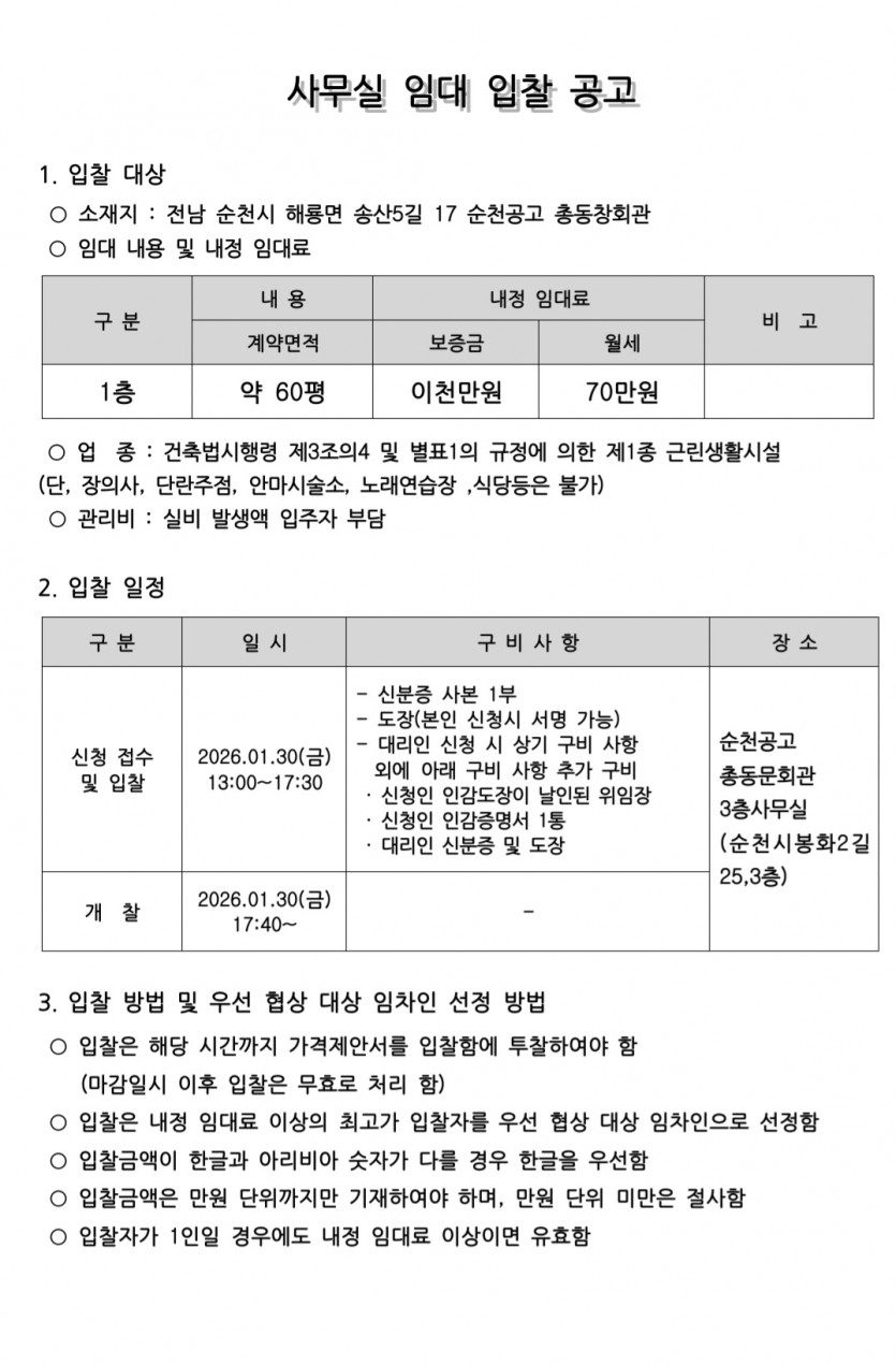 구)순천공고 총동문회관 사무실 임대 입찰 공고문 페이지 정보 작성자 총동문회 댓글 0건 조회 167회 작성일 26-01-22 11:38 목록 답변 본문 구)순천공고 총동문회관 사무실 임대 입찰 공고문 이전글<제47차 순천공업고등학교 총동문 가족화합한마당 축제 안내> 26.03.05 다음글재경 순천공업고등학교 총동문회 회장 이.취임식 및 신년회 행사 24.01.22 댓글 0 댓글목록 등록된 댓글이 없습니다.