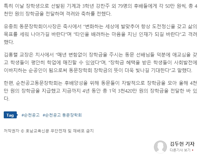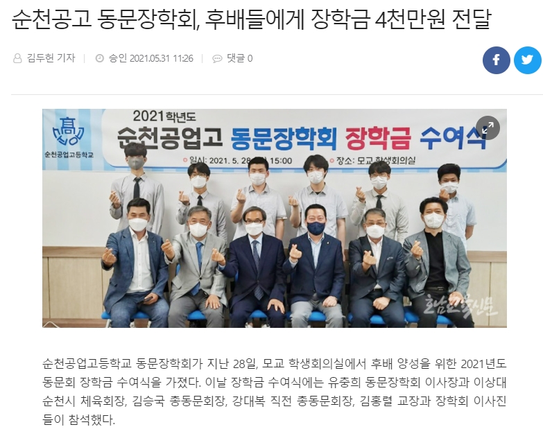재단법인 순천공고 동문장학회, 후배들에게 장학금 4천만원 전달 페이지 정보 작성자 총동문회 댓글 0건 조회 1,156회 작성일 21-06-02 11:53 목록 답변 본문 http://www.ihopenews.com/news/articleView.html?idxno=211292 이전글2021년도 (재)순천공고동문장학회 이사장 이.취임식 21.06.29 다음글2021년도 장학금전달식 21.06.01 댓글 0 댓글목록 등록된 댓글이 없습니다.