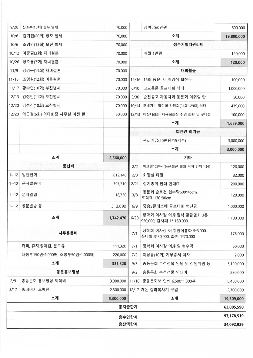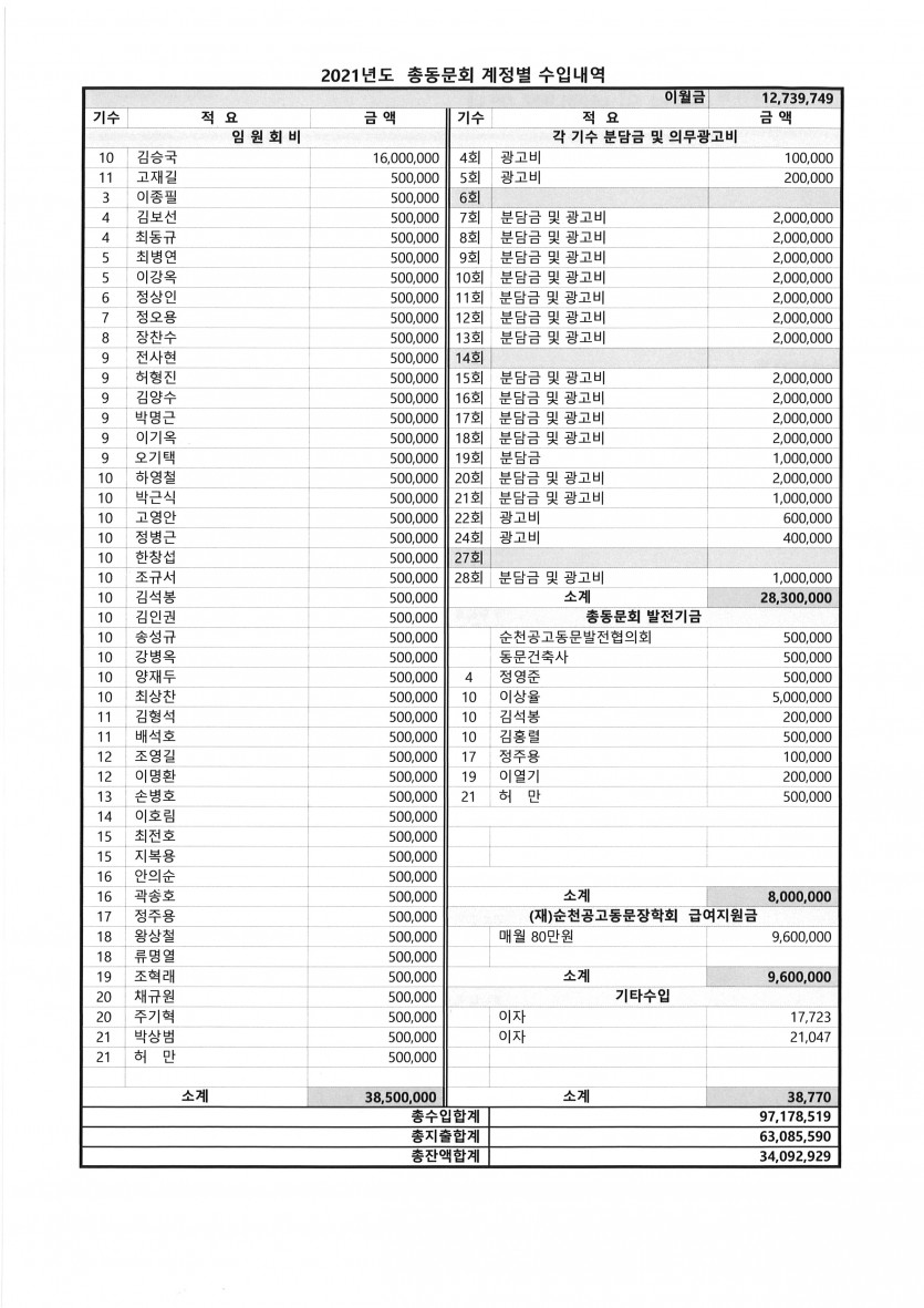 2021년도 순천공고총동문회 수입 . 지출 내역(2021.12.31 기준일) 페이지 정보 작성자 총동문회 댓글 0건 조회 2,389회 작성일 21-08-24 14:50 목록 답변 본문 이전글♡순천공고총동문회보 배부 및 다과회 안내♡ 21.11.10 다음글재단법인 순천공고동문장학회 신임 임원진 소개 21.07.13 댓글 0 댓글목록 등록된 댓글이 없습니다.