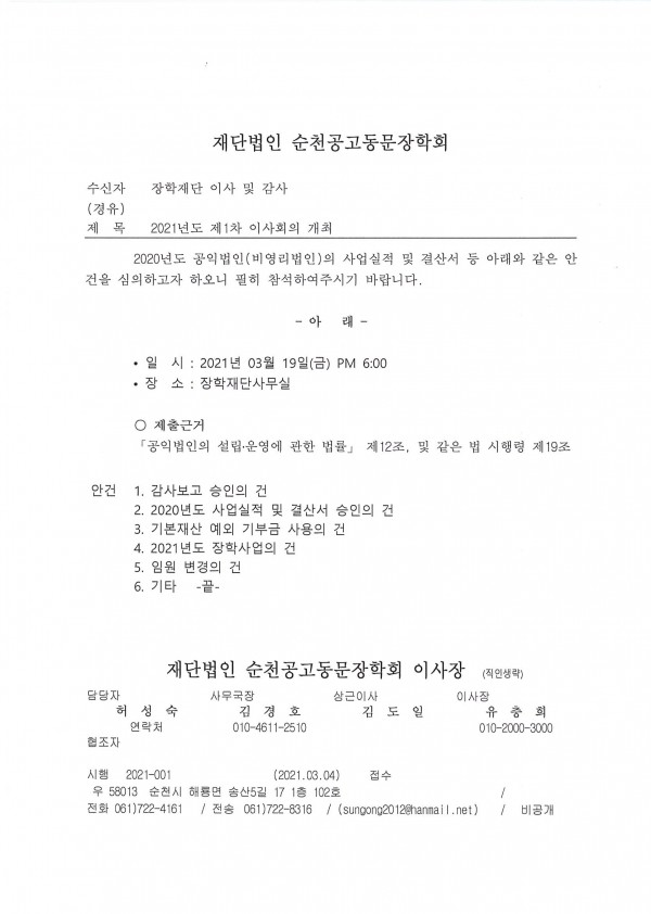 (재) 순천공고동문장학회 2020년도 제1차 이사회 페이지 정보 작성자 총동문회 댓글 0건 조회 744회 작성일 21-03-11 14:32 목록 답변 본문 공문발송 이전글2023년 기부금영수증 발급안내 21.04.15 댓글 0 댓글목록 등록된 댓글이 없습니다.