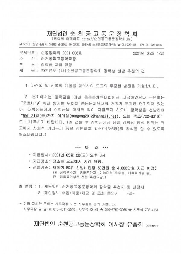 2021년도 (재)순천공고동문장학회 장학생선발 추천의 건 페이지 정보 작성자 총동문회 댓글 0건 조회 797회 작성일 21-05-12 13:19 목록 답변 본문 장학금 전달식 5월 28일 금요일 오후3시 이전글2018년도 총동문회 장학금 및 장학기금 수여식 21.05.31 댓글 0 댓글목록 등록된 댓글이 없습니다.